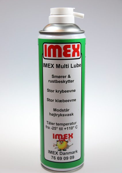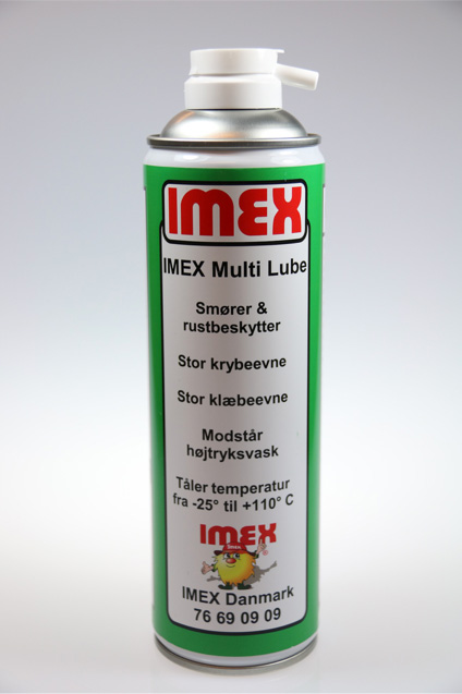 IMEX Multi Lube er en spray med helt unikke smøreegenskaber, den har en ekstrem krybe-, klæbe- og smøreevne. Den har en ekstrem høj indtrængningsevne, den kryber ind og smører på selv svært tilgængelige steder. Den er helt tynd når den sprayes på, så den kryber ind selv i de mindste åbninger. Efter få minutter sætter den sig som en fedt, og man opnår nu den ekstreme klæbe- og smøreevne.
